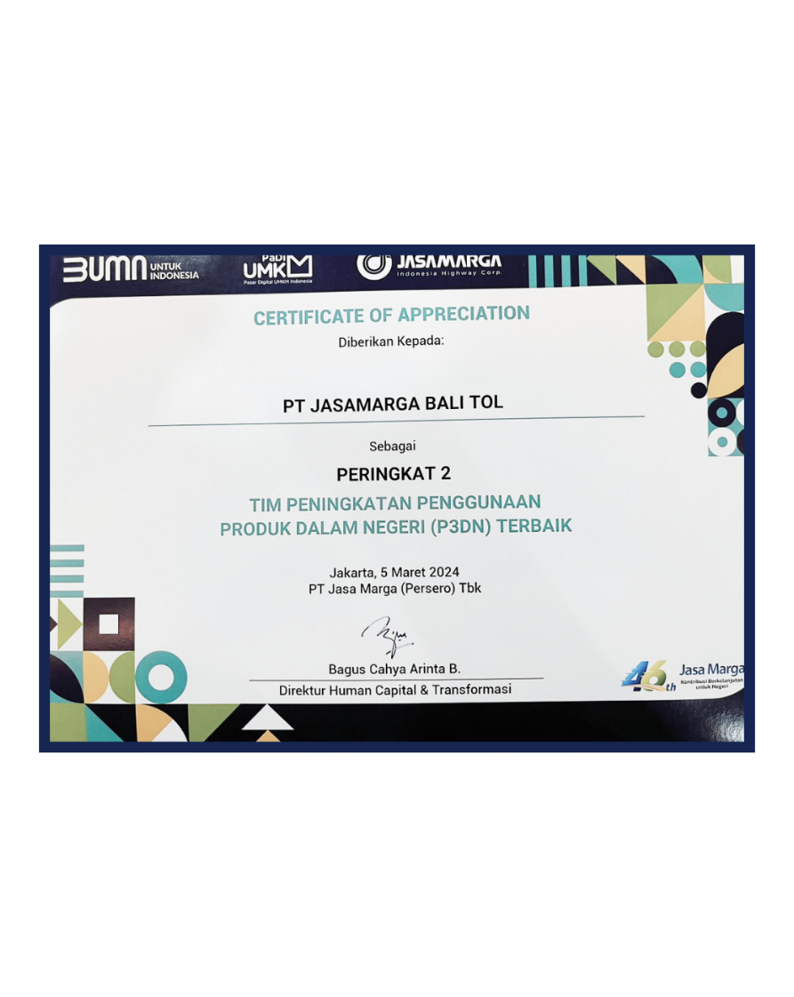 Sebagai bagian dari Jasa Marga Group, kami menghadirkan solusi transportasi modern di Bali melalui Tol Bali Mandara. Dengan standar keselamatan tinggi dan infrastruktur berkualitas, kami berkomitmen memberikan pengalaman berkendara terbaik untuk Anda.